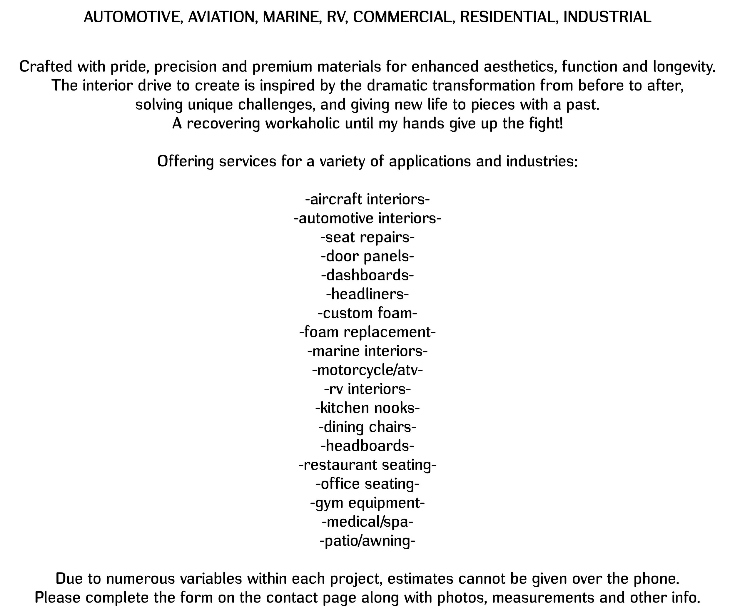 A text advertisement for automotive, aviation, marine, RV, commercial, residential, and industrial services, listing various applications such as aircraft interiors, auto interiors, seat repairs, door panels, dashboards, headliners, foam replacement, marine interiors, motorcycle and ATV interiors, RV interiors, kitchen nooks, dining chairs, headboards, restaurant and office seating, gym equipment, medical/spa, patio, and awning, with their promotional message about craftsmanship and service type.